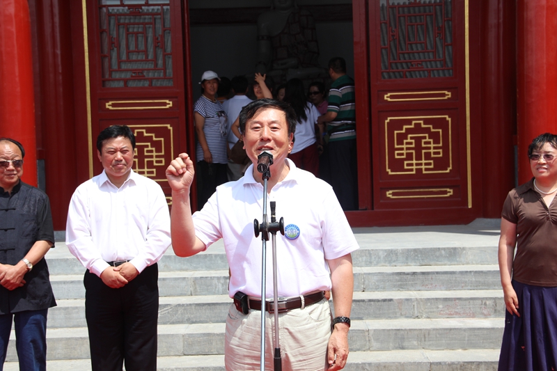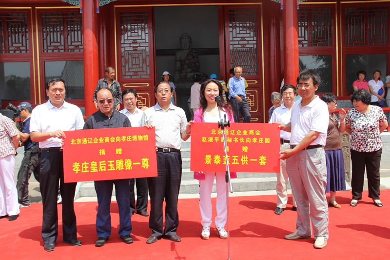 北京通遼企業(yè)商會(huì)副會(huì)長(zhǎng)、北京富貴天使珠寶公司董事長(zhǎng)魏相春及宋艷華女士向孝莊園捐贈(zèng)了由60噸緬甸玉原石雕刻的玉佛像一尊,佛像袈裟鑲嵌48880顆寶石;副秘書長(zhǎng)趙淑平捐贈(zèng)了景泰藍(lán)佛前五供等用品。魏相春會(huì)長(zhǎng)在捐贈(zèng)儀式上說(shuō):”關(guān)注民族文化、尊重民族歷史是我們每個(gè)中國(guó)人的職責(zé)”。充分體現(xiàn)了在京游子對(duì)家鄉(xiāng)的不了情。原政協(xié)主協(xié)王明義、會(huì)長(zhǎng)包國(guó)安及副會(huì)長(zhǎng)魏相春、宋艷華女士為玉佛揭幕,并合影留念。